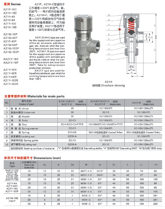 ③在銘牌注明的彈簧工作壓力級范圍內(nèi),通過旋轉(zhuǎn)調(diào)整螺桿改變彈簧壓縮量,即可對開啟壓力進行調(diào)節(jié)。