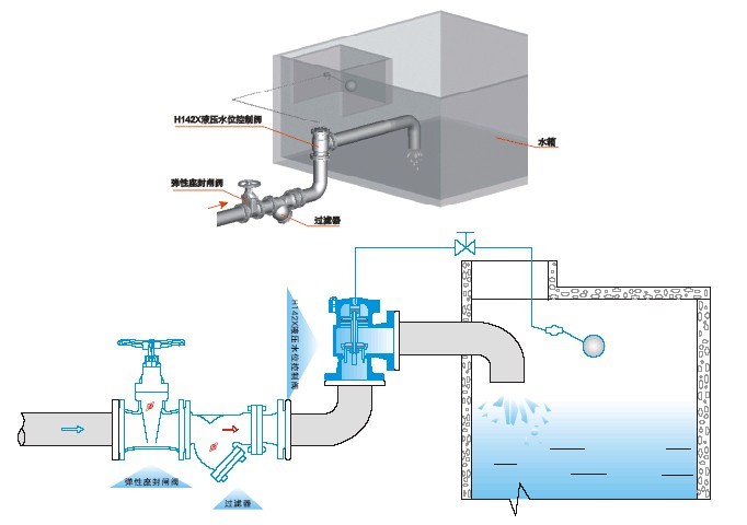 將該水位控制閥垂直固定在進(jìn)水管上,然后將控制管、截止閥和浮球閥連接旋緊在該閥上即可。該閥進(jìn)水管和出水管連接法蘭H142X-4T-A為0.6MPa標(biāo)準(zhǔn)法蘭;H142X-10-A為1MPa標(biāo)準(zhǔn)法蘭。進(jìn)水管直徑應(yīng)大于或等于閥門公稱通徑,出水口應(yīng)低于浮球閥。浮球閥安裝應(yīng)距離水管一米以上;在水箱內(nèi)出水管高于水位線處鉆一小孔,以防直空回水。使用時,截止閥應(yīng)全開,如同一水池安裝二只以上閥則應(yīng)保持同一水平面。因主閥關(guān)閉要滯后浮球閥關(guān)閉約30~50秒,故水箱要有足夠的空余容積,以防溢水。為防止雜質(zhì)、砂粒進(jìn)入閥內(nèi)引起工作失靈,閥前應(yīng)裝過濾器。如安裝在地下水池,則應(yīng)在地下泵房安裝報警裝置。
