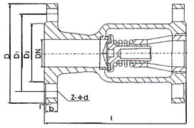 主要包括閥體、襯套、支座、閥瓣、密封圈、彈簧組成。該閥閥體內(nèi)裝有支座、閥瓣、耐高溫非金屬密封圈,支座一端旋接閥體出口端,另一端壓在耐高溫非金屬密封圈上。支座上連有支架,支架上連有閥桿套,閥桿套里裝有閥桿并與閥桿之間有一定間隙,閥桿與閥瓣連接。閥瓣的外表面有弧面。耐高溫非金屬密封墊放在閥座上,閥座與閥體連為一體。 閥瓣為不銹鋼閥瓣和耐磨、耐高溫、回彈性強的非金屬材料(8202)密封圈吻合,因一軟一硬,所以密封性能好,壽命長。
